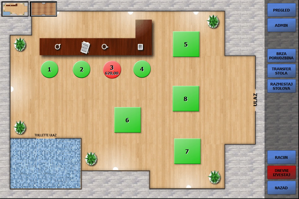 Zahvaljujući potpuno prilagodljivom interfejsu koji preslikava dimenzije i oblik ugostiteljskog objekta, ali i lokacije stolova u njemu, naš softver se u potpunosti integriše i prilagođava vašem poslovanju. Uzimajući u obzir sve parametre postojećeg poslovanja optimizuje ga i obezbeđuje povećanje profitne stope.