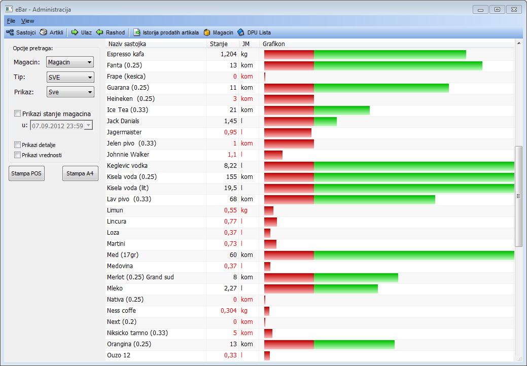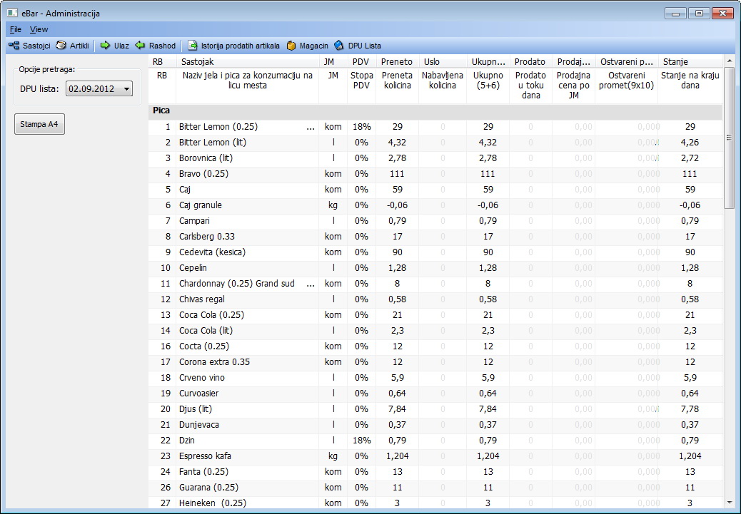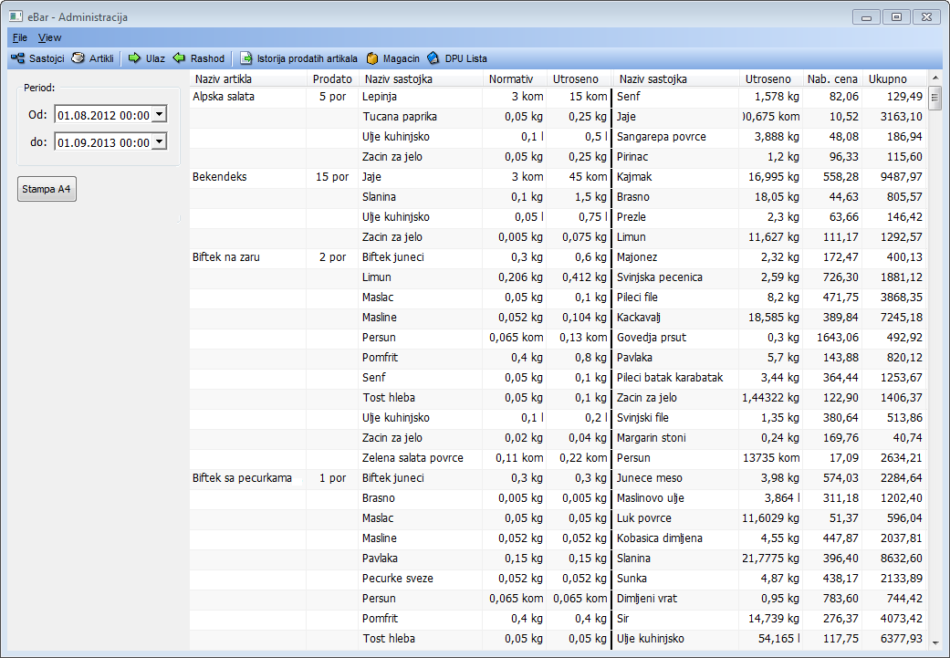 Svaki artikal sastoji se iz određenog broja sastojaka sa tačno definisanim količinama. Na osnovu toga se prilikom prodaje artikla automatski obračunava koliko je utrošeno sastojaka i ti iznosi se automatski umanjuju sa stanja.