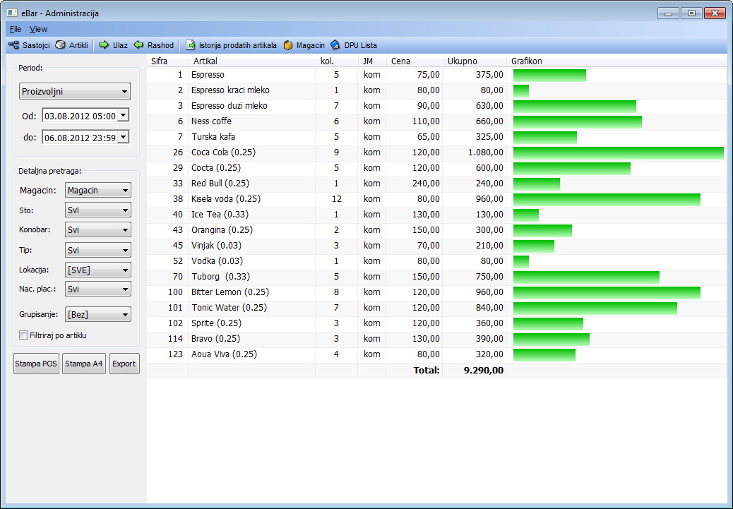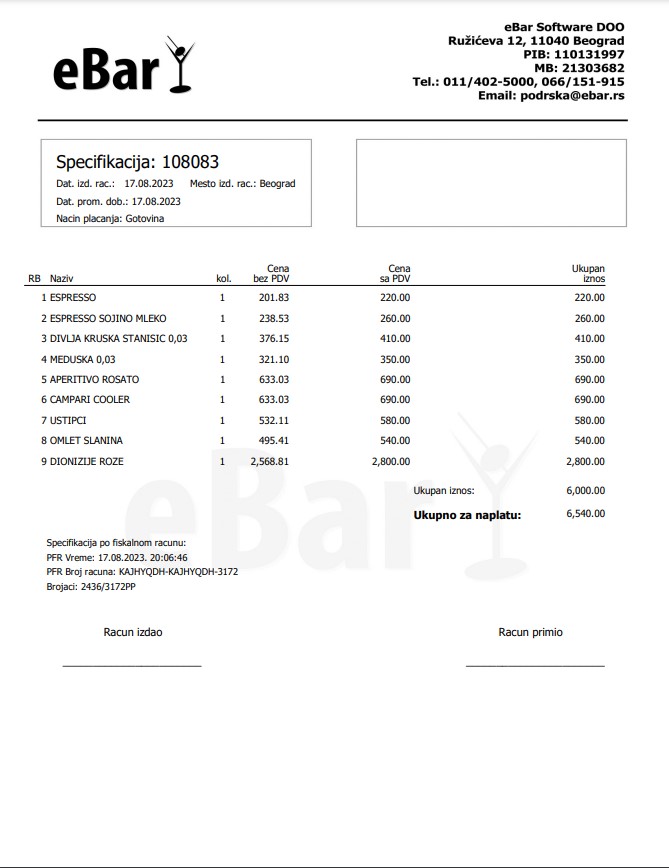 eBar omogućava generisanje reprezentativnog PDV računa u A4 formatu, sa logoom vašeg ugostiteljskog objekta. Osim što izgleda lepo, ovakav PDV račun predstavlja i besplatnu reklamu za vaše preduzeće.