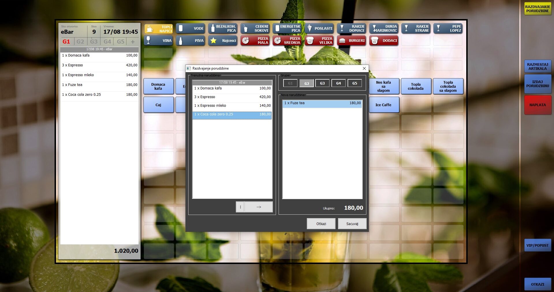 Iako je najčešća situacija da jedan sto ima jedinstven račun, ponekad se desi situacija kada gost želi da plati samo svoj deo. eBar donosi mogućnost razdvajanja porudžbine, gde se na jednostavan način mogu izdvojiti stavke i na taj način od jednog računa napraviti onoliko različitih računa koliko je potrebno.